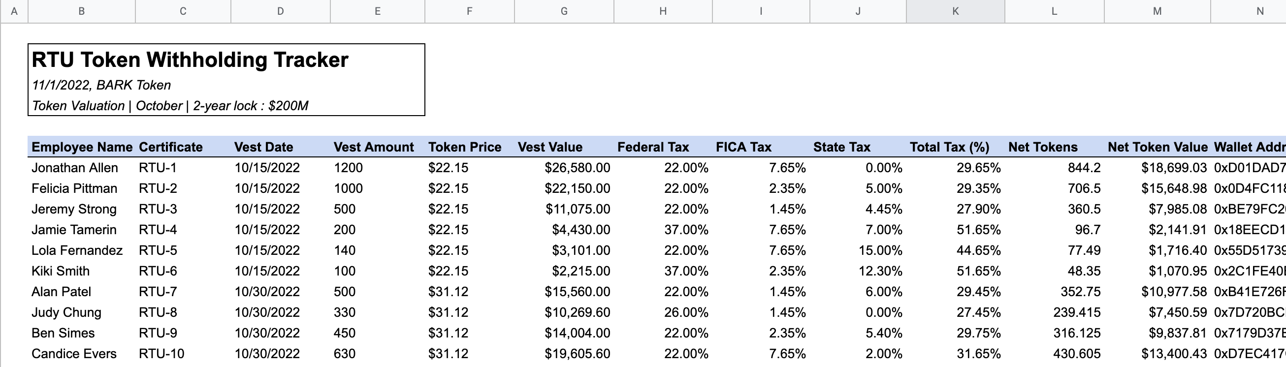 In order to do this, the company has to track hundreds of vest events, token prices, tax bases, and wallet addresses. Their spreadsheet might look something like this:
