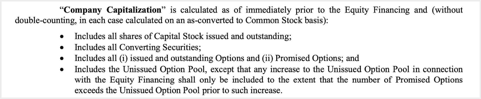 - Includes the Unissued Option Pool, except that any increase to the Unissued Option Pool in connection with the Equity Financing shall only be included to the extent that the number of Promised Options exceeds the Unissued Option Pool prior to such increase - this means that the company capitalization does NOT include increases to your equity pool that's required as part of your series A. Most series A term sheets require increasing your equity pool so that you have enough equity to hire talent after your next round. This increase in your equity pool is not included in the company capitalization calculation.